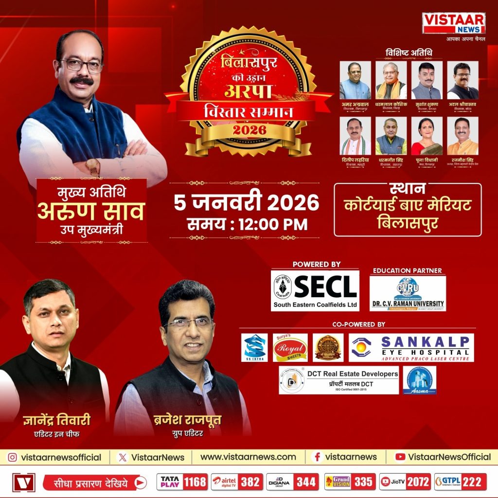 Arpa Vistaar Samman: अरपा नदी के किनारे बसे बिलासपुर शहर में Vistaar News का महामंच सज चुका है. छत्तीसगढ़ की ‘न्यायधानी’ बिलासपुर में 05 जनवरी को 12 बजे से दिग्गजों का जमावड़ा लगने वाला है. विस्तार न्यूज के खास प्रोग्राम बिलासपुर की उड़ान ‘अरपा विस्तार सम्मान’ में प्रदेश के डिप्टी CM अरुण साव, विधायक धरमलाल कौशिक और पूर्व मंत्री अमर अग्रवाल समेत कई दिग्गज नेता इस मंच पर विकास, रफ्तार और उड़ान की बातें करेंगे.
