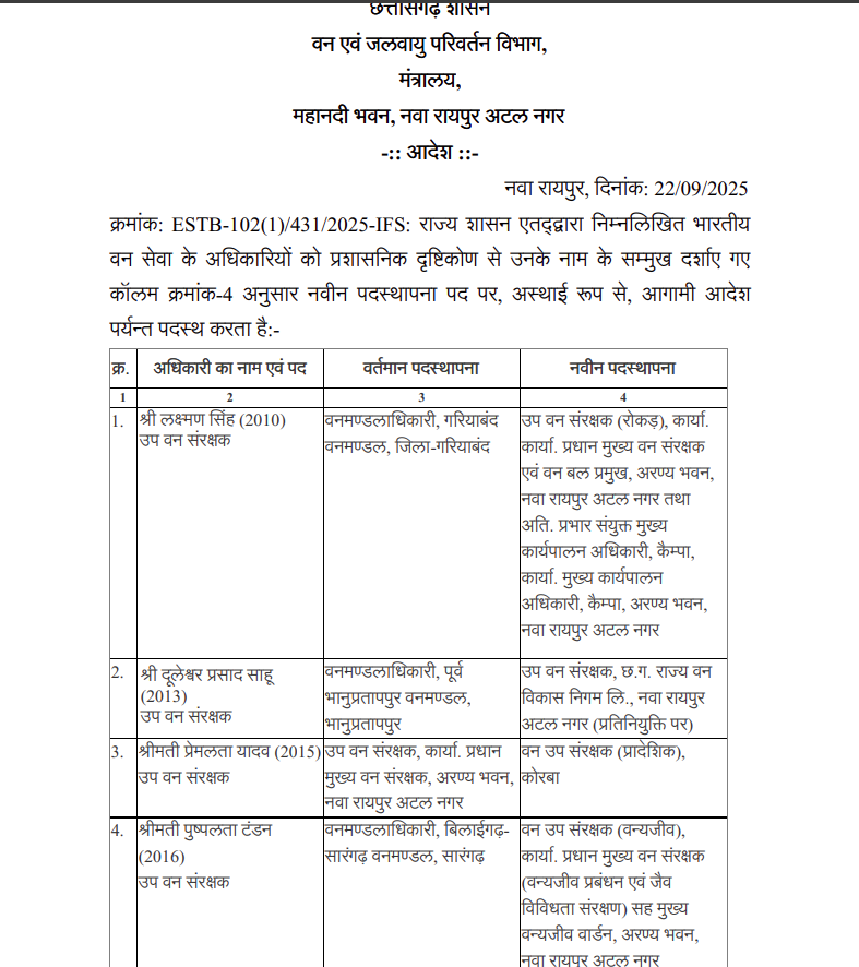 जिन अधिकारियों का ट्रांसफर किया गया है, उनमें लक्ष्मण सिंह नया रायपुर, प्रेमलता यादव कोरबा, पुष्पलता टंडन अरण्य भवन समेत कई अधिकारी शामिल हैं.