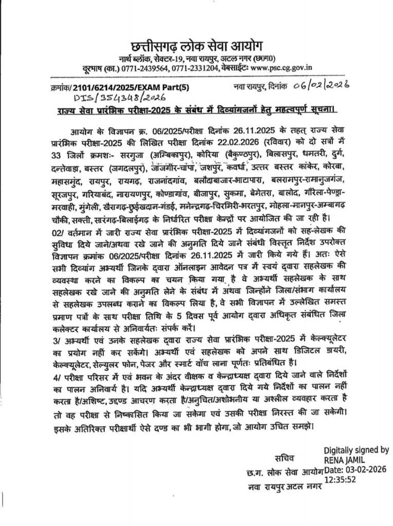 CGPSC Exam: छत्तीसगढ़ लोक सेवा आयोग ने राज्य सेवा प्रारंभिक परीक्षा 2025 के लिए एडमिट कार्ड जारी कर दिया है. जिसके अनुसार, CGPSC की प्रारंभिक परीक्षा प्रदेश के सभी 33 जिलों के परीक्षा केन्द्रों में 22 फरवरी 2026 को आयोजित की जाएगी.