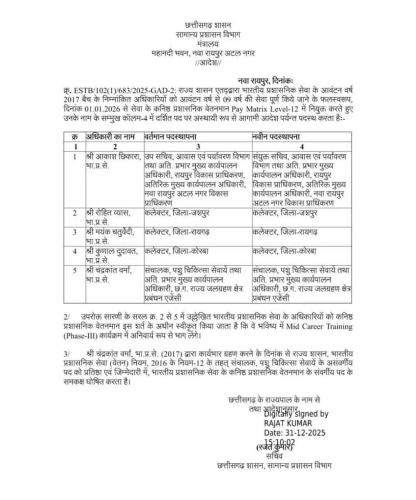 वहीं 2017 बैच के 5 आईएएस संयुक्त सचिव बने. इसमें आकाश छिकारा, रोहित व्यास, मयंक चतुर्वेदी, कुणाल दुदावत, चंद्रकांत वर्मा प्रमोट का नाम शामिल हैं.