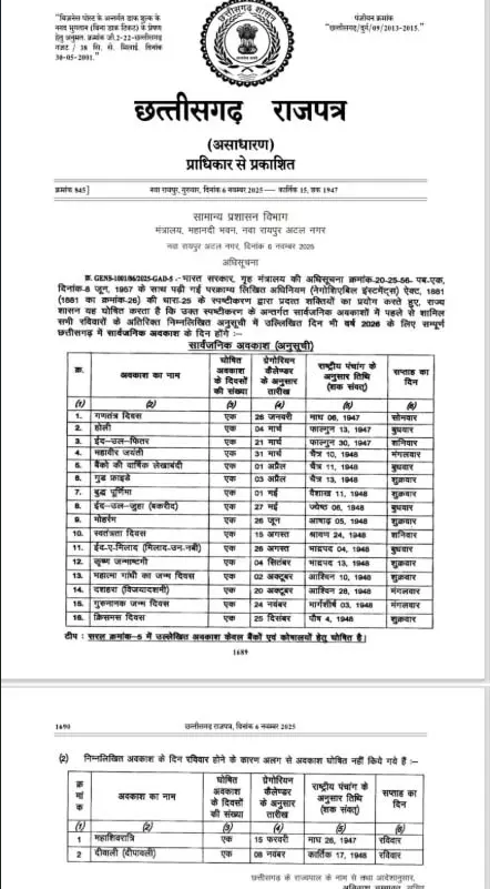 CG News: छुट्टियां ही छुट्टियां… साल 2026 के लिए छत्तीसगढ़ सरकार का कैलेंडर जारी, देखें छुट्टियों की पूरी लिस्ट