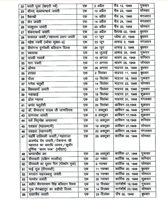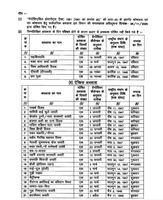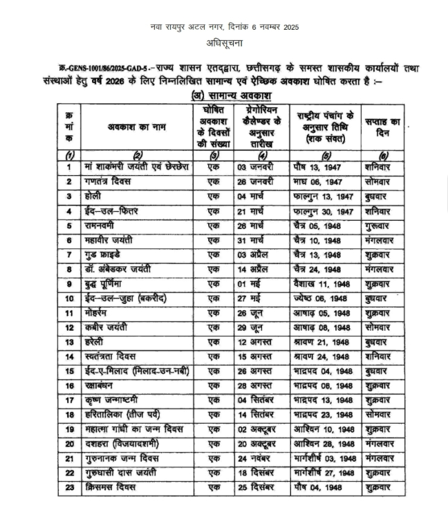 छत्तीसगढ़ सरकार ने 2026 के लिए अवकाश जारी की