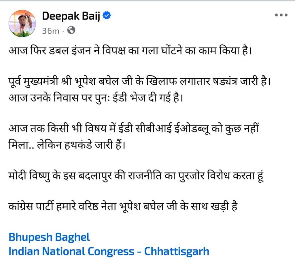 वहीं भूपेश बघेल के घर ED की छापेमारी पर पीसीसी चीफ दीपक बैज ने सोशल मीडिया पर पोस्ट कर लिखा कि डबल इंजन ने विपक्ष का गला घोटने का काम किया है, आज पूर्व मुख्यमंत्री के निवास पर ईडी भेज दी गई है. को आज तक कुछ नहीं मिला हथकंडे जारी है. बदलापुर की राजनीति का विरोध करते है.