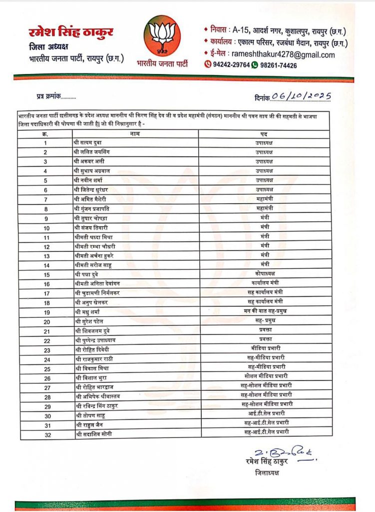 रायपुर भाजपा जिले में सत्यम दुवा, ललित जयसिंह, अकबर अली, सुभाष अग्रवाल , नवीन शर्मा, जितेन्द्र धुरंधर को उपाध्यक्ष बनाया गया है. अमित मैशेरी और गुंजन प्रजापति को महामंत्री की जिम्मेदारी मिली है. तुषार चोपड़ा और संजय तिवारी को जिला मंत्री और पन्ना दुबे को कोषाध्यक्ष नियुक्त किया गया है.