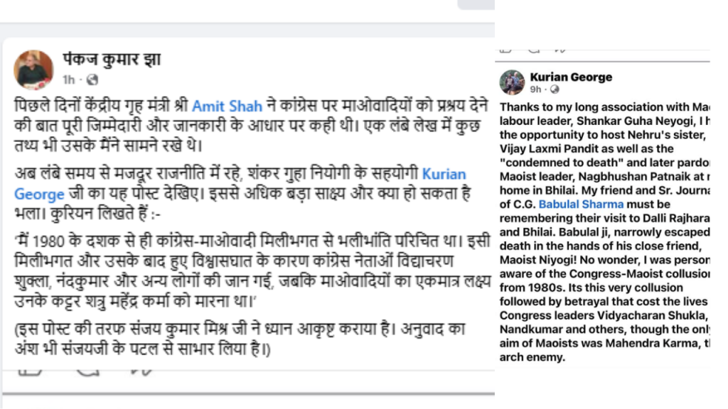 भिलाई के लेखक जॉर्ज कुरियन ने पोस्ट शेयर कर नक्सलवाद को लेकर कांग्रेस पर गंभीर आरोप लगाए हैं. वहीं CM विष्णु देव साय के मीडिया सलाहकार पंकज झा ने उनके पोस्ट को रिपोस्ट करते हुए लिखा- पिछले दिनों केंद्रीय गृह मंत्री Amit Shah ने कांग्रेस पर माओवादियों को प्रश्रय देने की बात पूरी जिम्मेदारी और जानकारी के आधार पर कही थी. एक लंबे लेख में कुछ तथ्य भी उसके मैंने सामने रखे थे. अब लंबे समय से मजदूर राजनीति में रहे, शंकर गुहा नियोगी के सहयोगी Kurian George जी का यह पोस्ट देखिए.