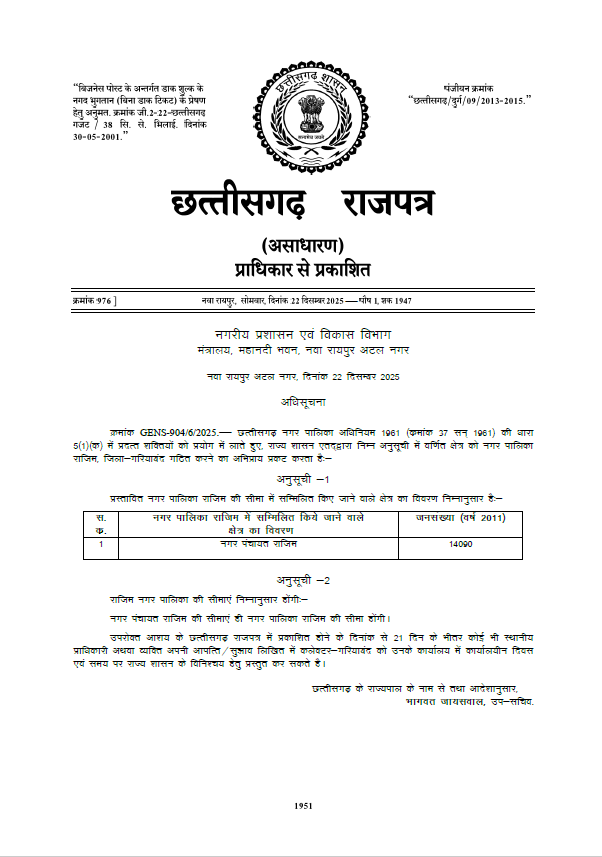 CG News: राजिम को नगर पंचायत से नगर पालिका बनाने की अधिसूचना राजपत्र में प्रकाशित कर दी गई है. पंचायत से पालिका बनने से राजिम को न केवल अब विकास के लिए ज्यादा बजट मिलेगा.