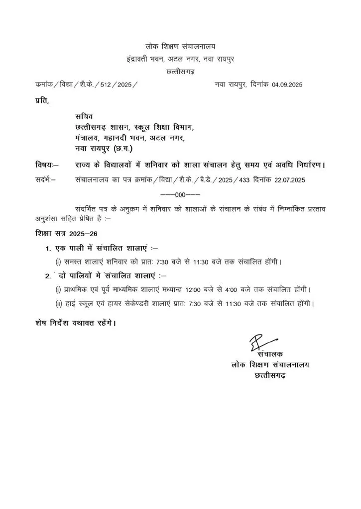 Chhattisgarh: छत्तीसगढ़ के स्कूलों का समय बदलने वाला है. शिक्षक संगठनों के दबाव के बाद शनिवार को स्कूल संचालन का समय पूर्व की भांति सुबह 7.30 बजे होगा. व्यावहारिक दिक्कतों को देखते हुए स्कूल शिक्षा मंत्री गजेन्द्र यादव के निर्देश पर लोक शिक्षण संचालनालय ने शिक्षा सचिव को शनिवार को स्कूल का समय 7.30 बजे रखने का प्रस्ताव भेजा है. संभवतः सोमवार को अनुमोदन होने के बाद अधिकृत रूप से आदेश जारी कर दिया जाएगा.