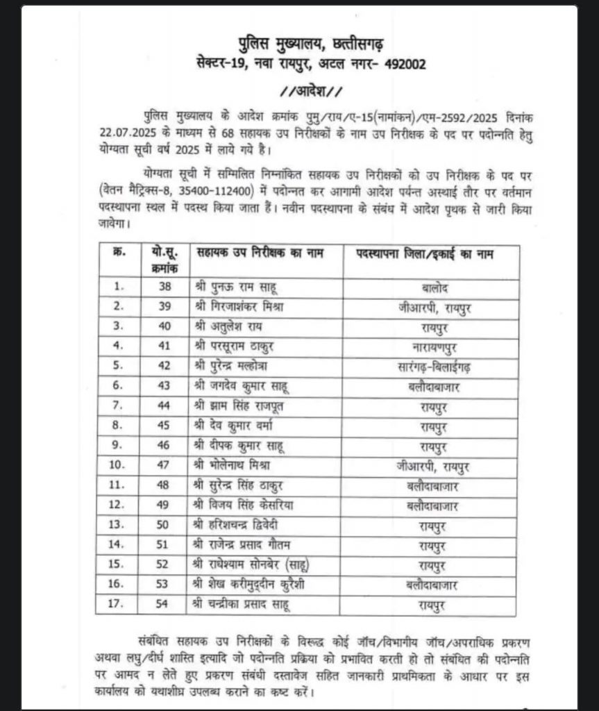CG Police Promotion: छत्तीसगढ़ के 17 ASI का सब इंस्पेक्टर के पद पर हुआ प्रमोशन, यहां चेक करें लिस्ट