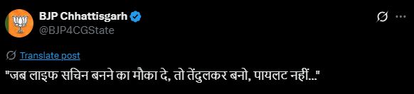 BJP ने सोशल मीडिया प्लेटफॉर्म X पर एक पोस्ट शेयर किया है. इसमें लिखा है- ‘जब लाइफ सचिन बनने का मौका दे, तो तेंदुलकर बनो, पायलट नहीं…’