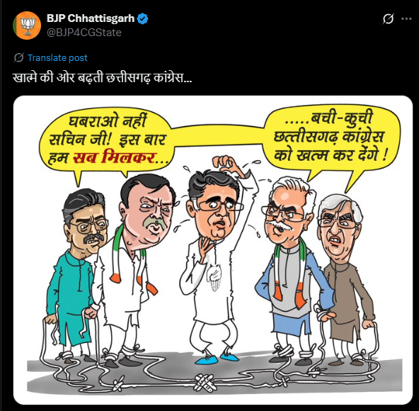 इसके अलावा BJP ने एक कार्टून पोस्टर भी जारी किया है. इस पोस्टर को जारी करते हुए BJP ने लिखा- ‘खात्मे की ओर बढ़ती छत्तीसगढ़ कांग्रेस…’ इस कार्टून पोस्टर में प्रदेश प्रभारी सचिन पायलट के साथ पूर्व CM भूपेश बघेल, पूर्व डिप्टी CM TS सिंह देव, PCC चीफ दीपक बैज और छत्तीसगढ़ विधानसभा में नेता प्रतिपक्ष चरणदास महंत नजर आ रहे हैं.