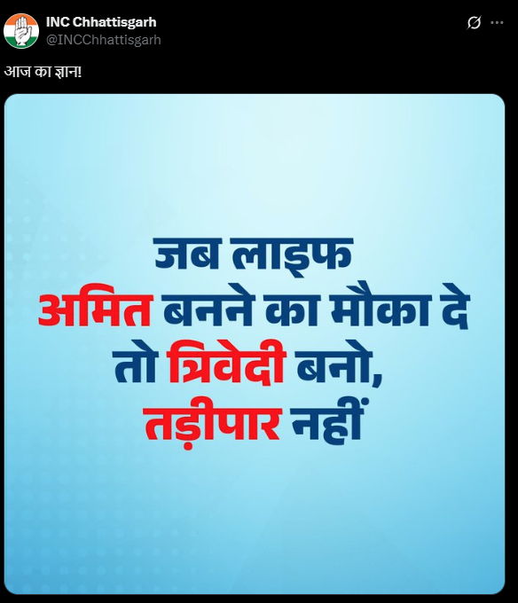 BJP की पोस्ट पर कांग्रेस ने भी पलटवार किया है. कांग्रेस ने ‘आज का ज्ञान’ लिखते हुए एक पोस्टर शेयर किया है, जिसमें लिखा है- ‘जब लाइफ अमित बनने का मौका दे तो त्रिवेदी बनो, तड़ीपार नहीं.’