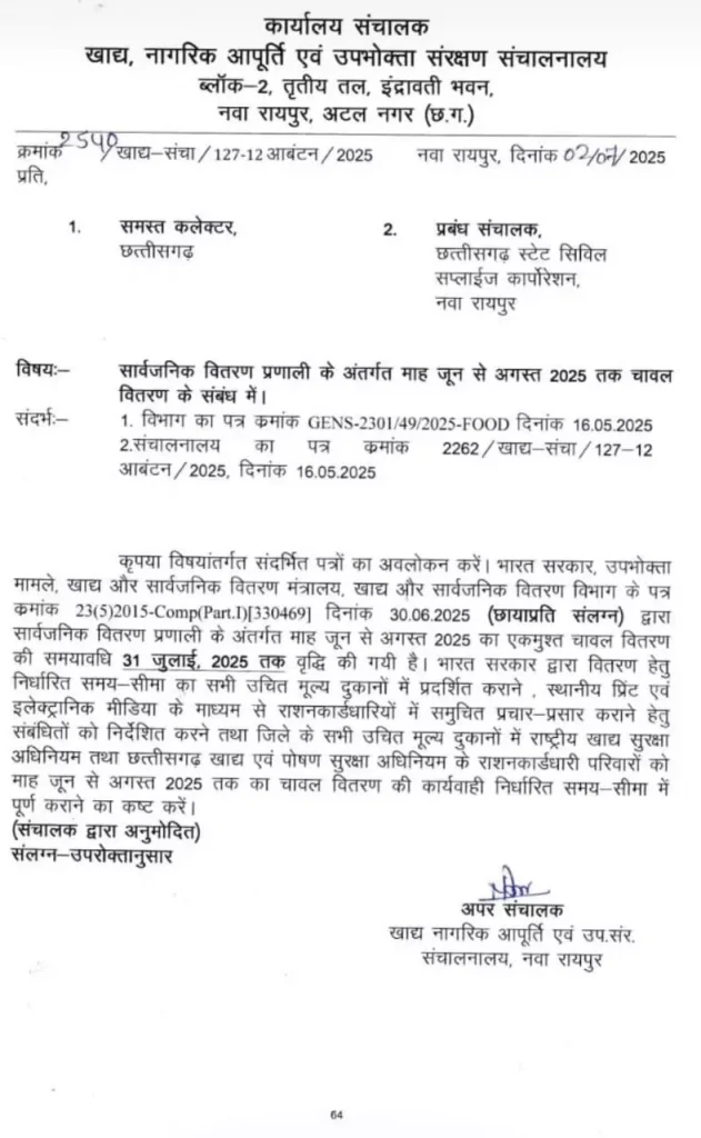 खाद्य एवं नागरिक आपूर्ति विभाग द्वारा बुधवार को जारी आदेश में स्पष्ट किया गया कि अब लोग 31 जुलाई 2025 तक अपना राशन प्राप्त कर सकेंगे. पहले तय की गई समय-सीमा को बढ़ाकर लोगों को अतिरिक्त समय देने का फैसला लिया गया है, जिससे कोई भी लाभार्थी राशन से वंचित न रह जाए।इसको लेकर बाकायदा सरकार ने आदेश भी जारी कर दिया है.