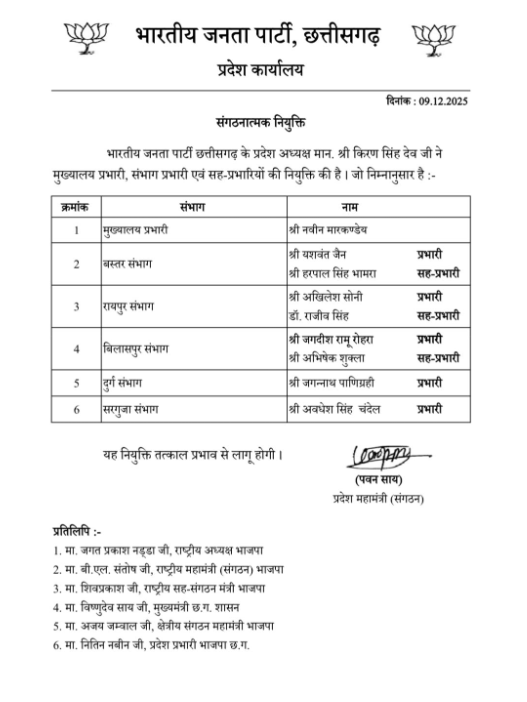 छत्तीसगढ़ BJP ने संभाग प्रभारियों की लिस्ट जारी की.