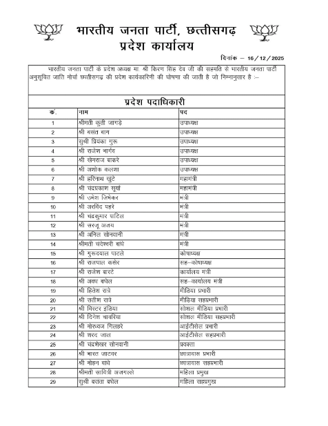 छत्तीसगढ़ BJP की अनुसूचित जाति और अल्पसंख्यक मोर्चा की प्रदेश कार्यकारिणी घोषित, देखें किसे कौनसी मिली जिम्मेदारी
