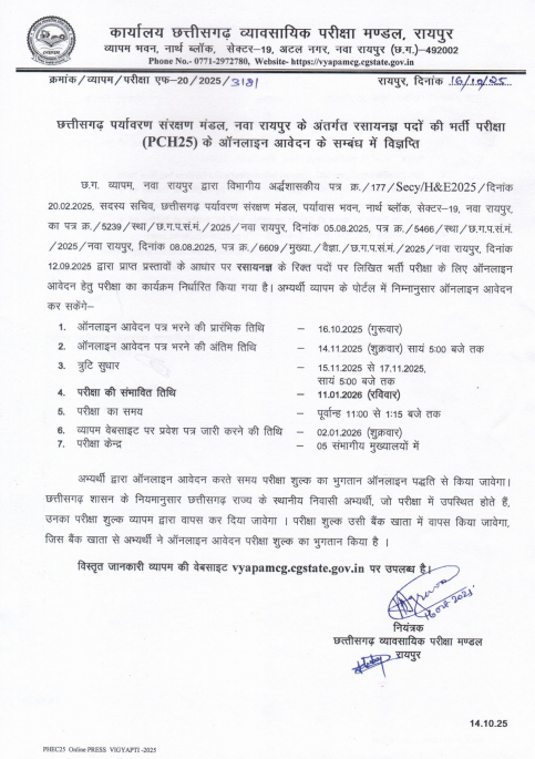 पहले व्यापम की वेबसाइट https://vyapamcg.cgstate.gov.in/ पर जाएं. “PCH25-Chemist Recruitment 2025” लिंक पर क्लिक करें। ऑनलाइन आवेदन पत्र भरें और आवश्यक दस्तावेज अपलोड करें. ऑनलाइन भुगतान करें और आवेदन पत्र सबमिट करें. आवेदन का प्रिंट आउट अवश्य लें.