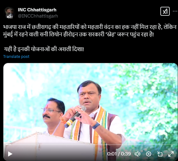 छत्तीसगढ़ कांग्रेस ने अपने सोशल मीडिया अकाउंट पर दीपक बैज का ये वीडियो शेयर करते हुए लिखा- ‘BJP राज में छत्तीसगढ़ की महतारियों को महतारी वंदन का हक नहीं मिल रहा है, लेकिन मुंबई में रहने वाली सनी लियोन हीरोइन तक सरकारी ‘स्नेह’ जरूर पहुंच रहा है! यही है इनकी योजनाओं की असली दिशा!’