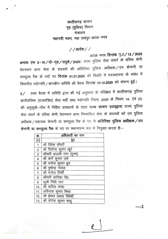 CG Promotion News: नए साल के पहले राज्य सरकार ने राज्य पुलिस सेवा के 16 अफसरों का प्रमोशन किया. इन अधिकारियों में रितेश चौधरी, जितेन्द्र कुमार खूंटे, अंजली नाग (गुप्ता), कर्ण कुमार उके, मनोज कुमार ध्रुव, पुष्पेन्द्र नायक, मनोज तिर्की, सारिका वैद्य, निधि नाग, कपिल चन्द्रा, अविनाश कुमार मिश्रा, ईश्वर प्रसाद त्रिवेदी, योगेश कुमार साहू, मयंक तिवारी, रश्मीत कौर चांवल और अनिल कुमार विश्वकर्मा का नाम शामिल हैं. इसे लेकर गृह विभाग ने आदेश जारी किया है.