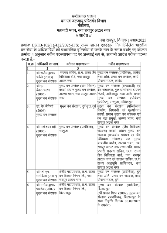 वन विभाग के अवर सचिव डी.आर. चंद्रवंशी की ओर से जारी सूची में 13 वरिष्ठ अधिकारियों के नाम शामिल हैं. इस फेरबदल में कई मुख्य वन संरक्षकों (CCF) और वन संरक्षकों को नए दायित्व सौंपे गए हैं. रायपुर के सीसीएफ के रूप में मनिगावसन को नियुक्त किया गया है, जो अब राज्य के वन्य क्षेत्रों की समग्र निगरानी और संरक्षण कार्यों की जिम्मेदारी संभालेंगे.