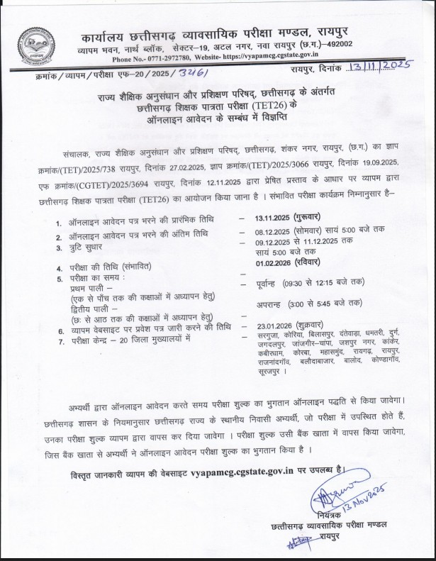 जारी नोटिफिकेशन के मुताबिक, CG TET 2025 परीक्षा 1 फरवरी 2026 को आयोजित की जाएगी. छत्तीसगढ़ शिक्षक पात्रता परीक्षा की तैयारी कर रहे उम्मीदवारों को पात्रता, पाठ्यक्रम और आवेदन की अंतिम तिथियों से संबंधित आधिकारिक घोषणाओं से अपडेट रहना चाहिए.