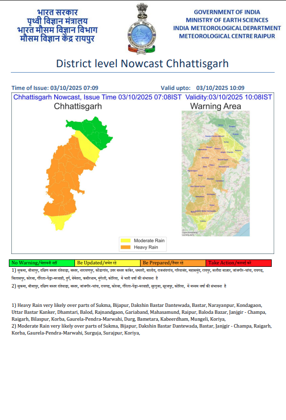 इतना ही नहीं मौसम विभाग ने बस्तर, कांकेर, कोंडागांव, दंतेवाड़ा, सुकमा, बीजापुर, नारायणपुर, बालोद, बेमेतरा, दुर्ग, कबीरधाम, खैरागढ़-छुई खदान-गंडई, मोहला-मानपुर चौकी और राजनांदगांव जिले के लिए ऑरेंज अलर्ट जारी किया है. मौसम विभाग ने बलौदाबाजार, जांजगीर-चांपा, सक्ती, सरंगढ़-बिलाईगढ़, मुंगेली और बिलासपुर में भी बारिश के आसार है.