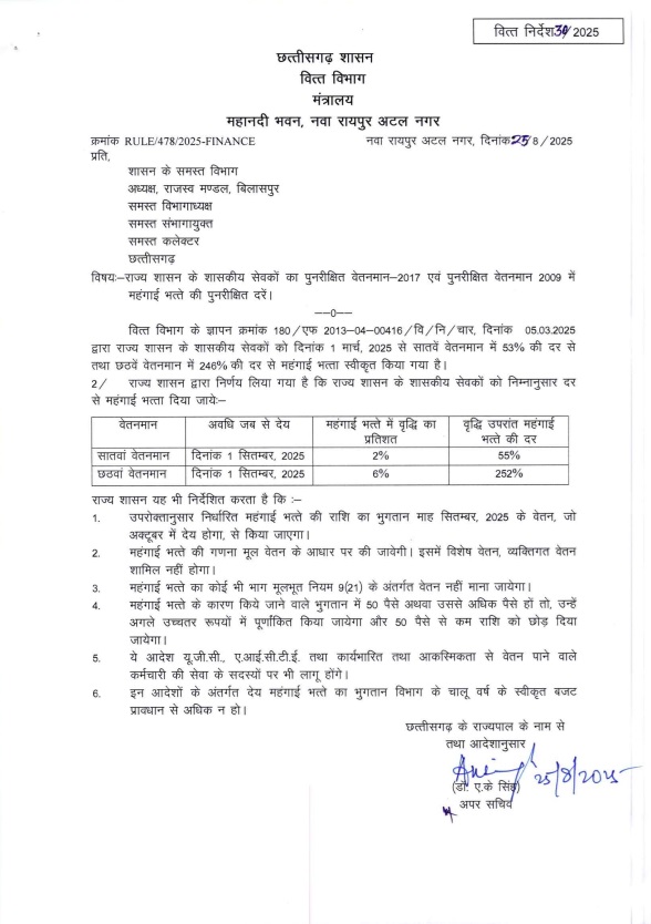 सरकारी अधिकारी कर्मचारियों के लिए महंगाई भत्ता 2% बढ़ाकर 55  प्रतिशत कर दिया गया है. छठवें वेतनमान वालों को 6% प्रतिशत महंगाई भत्ता में इजाफे के बाद 252 प्रतिशतत दिया जाएगा. इसे लेकर आदेश जारी किया गया है.