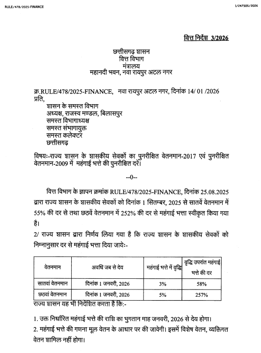 छत्तीसगढ़ के सराकरी कर्मचारियों के लिए यह बढ़ा हुआ महंगाई भत्ता 1 जनवरी 2026 से लागू होगा. महंगाई भत्ते में 3 प्रतिशत बढ़ोतरी होने से करीब 3.9 लाख कर्मचारियों को फायदा होगा. इससे पहले अगस्त 2025 में इसे 2 प्रतिशत बढ़ाया गया था.