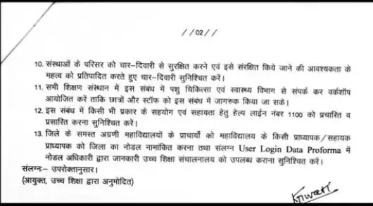 उच्च शिक्षा विभाग ने कॉलेज-विश्वविद्यालय के लिए कुछ जरूरी निर्देश जारी किए है. इसमें प्रोफेसरों को खाद्य सामग्री तो खुले में ना रखने के बात कही है. ताकि आवारा पशु इससे आकर्षित होकर अंदर प्रवेश न करें. साथ ही संस्थानों को परिसर की बाउंड्री वॉल बेहतर करने के भी निर्देश जारी किए हैं. ऐसा करने से आवारा कुत्तों और पशुओं के प्रवेश पर रोक लग सकेगी.
