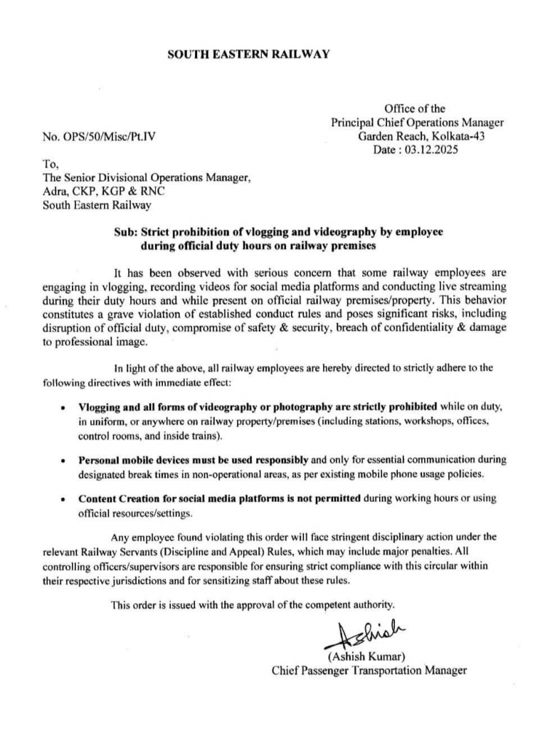 SECR ने नए नियम को लेकर आदेश जारी कर दिया है. आदेश के तहत रेल कर्मचारी किसी भी परिसर जैसे स्टेशन, कार्यशाला, कंट्रोल रूम, कार्यालय, ट्रेन, यार्ड या किसी भी प्रतिबंधित क्षेत्र में ब्लॉगिंग, वीडियोग्राफी, फोटोग्राफी या इंटरनेट मीडिया के लिए किसी भी तरह की रिकॉर्डिंग नहीं कर सकते हैं.