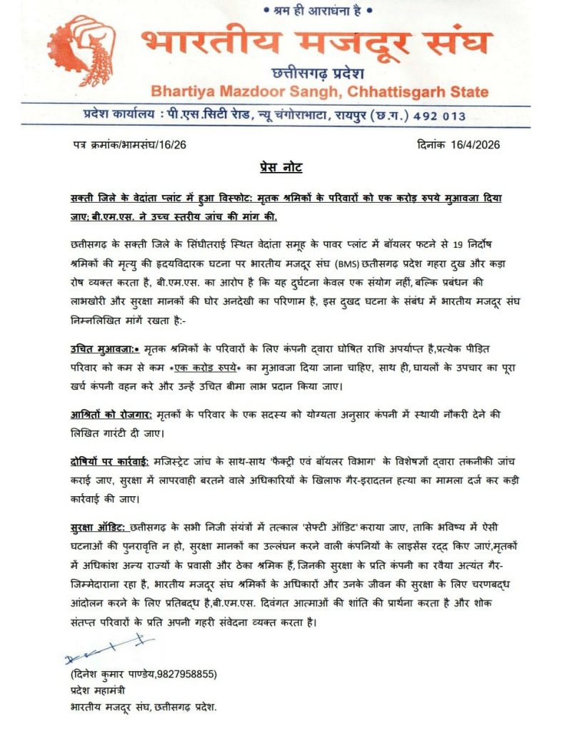 मजदूर संघ ने हादसे में मृतकों के परिजनों को 1 करोड़ रुपये मुआवजा देने की मांग की है. संघ के द्वारा जारी पत्र में लिखा कि- छत्तीसगढ़ के सक्ती जिले के सिंघीतराई स्थित वेदांता समूह के पावर प्लांट में बॉयलर फटने से 19 निर्दोष श्रमिकों की मृत्यु की हृदयविदारक घटना पर भारतीय मजदूर संघ (BMS) छत्तीसगढ़ प्रदेश गहरा दुख और कड़ा रोष व्यक्त करता है, बी.एम.एस. का आरोप है कि यह दुर्घटना केवल एक संयोग नहीं, बल्कि प्रबंधन की लाभखोरी और सुरक्षा मानकों की घोर अनदेखी का परिणाम है.