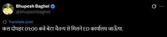 भूपेश बघेल ने ED ऑफिस जाने की जानकारी खुद सोशल मीडिया पर दी है. उन्होंने X पर पोस्ट करते हुए लिखा- ‘कल दोपहर 1 बजे बेटा चैतन्य से मिलने ED कार्यालय जाऊंगा.’