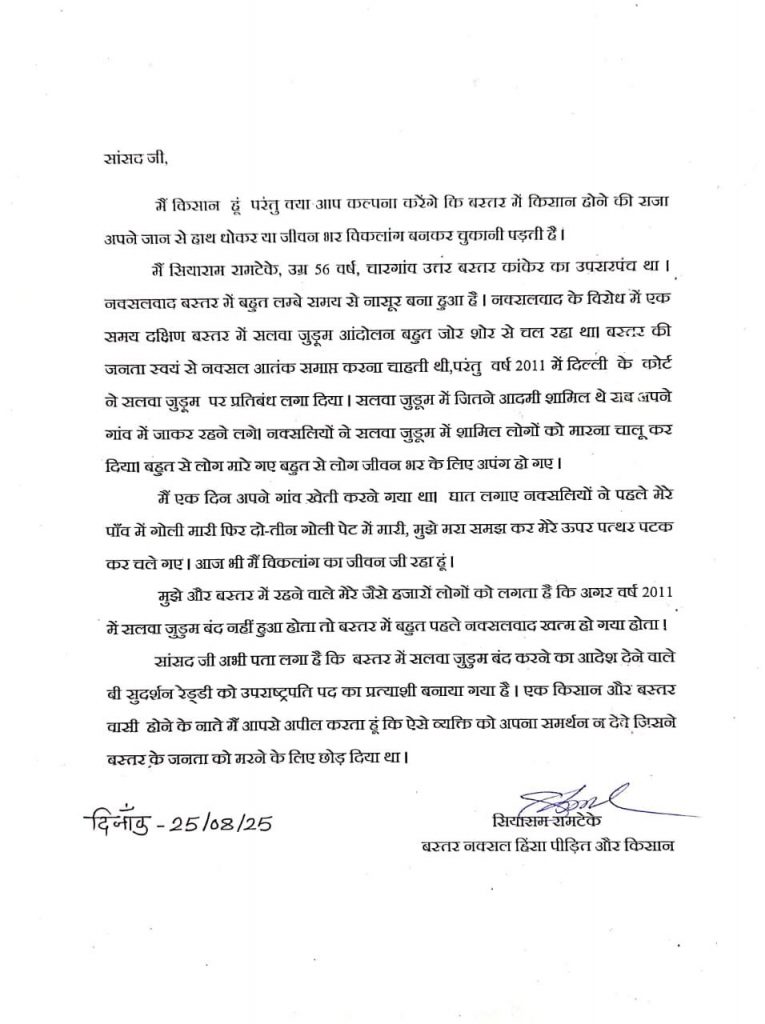उपराष्ट्रपति चुनाव: कांकेर के नक्सली हिंसा पीड़ित का विपक्ष को पत्र, कहा- सलवा जुडूम खत्म करने वाले रेड्डी का न करें समर्थन