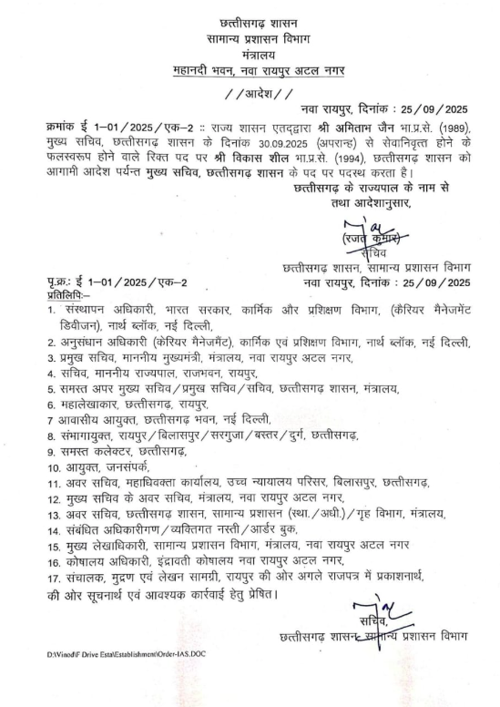 छत्तीसगढ़ शासन की तरफ से गुरुवार को आधिकारिक लेटर जारी करके ये जानकारी दी गई है. लेटर में बताया गया है कि 30 सितंबर को अमिताभ जैन मुख्य सचिव के पद से रिटायर हो रहे हैं, जिनकी जगह विकास शील लेंगे.