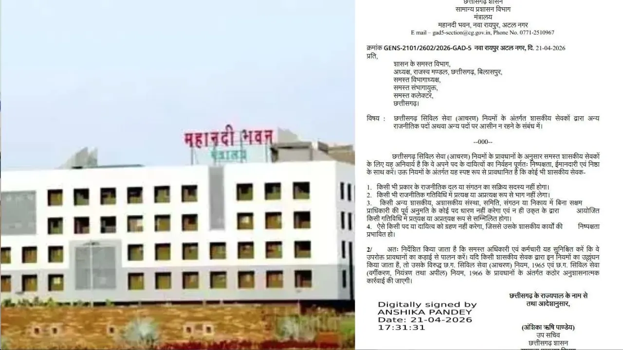 जारी आदेश में लिखा है कि छत्तीसगढ़ सिविल सेवा (आचरण) नियमों के अनुसार सभी शासकीय कर्मचारियों को अपने काम को पूरी ईमानदारी, निष्पक्षता और जिम्मेदारी के साथ करना अनिवार्य है. इन नियमों में साफ कहा गया है कि कोई भी सरकारी कर्मचारी किसी राजनीतिक दल या संगठन का सदस्य नहीं बनेगा और न ही किसी राजनीतिक गतिविधि में सीधे या परोक्ष रूप से भाग लेगा. इसके अलावा, वह बिना अनुमति किसी अन्य सरकारी या गैर-सरकारी संस्था, समिति या संगठन में कोई पद भी नहीं ले सकता.