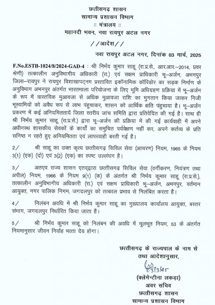 रायपुर-विशाखापटनम इकोनॉमिक कॉरिडोर के लिए भारतमाला परियोजना भूमि अधिग्रहण प्रक्रिया में गड़बड़ी पर SDM और वर्तमान में जगदलपुर नगर निगम आयुक्त निर्भय साहू (राप्रसे) को राज्य सरकार ने तत्काल प्रभाव से सस्पेंड कर दिया गया है. उन पर वास्तविक मुआवजे से अधिक मुआवजा देने का आरोप है. वहीं सामान्य प्रशासन विभाग ने आदेश जारी किया है.