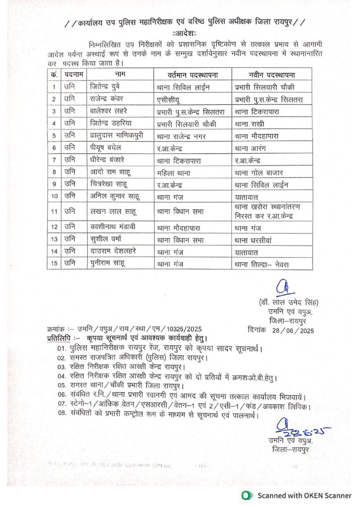 रायपुर पुलिस विभाग में 15 SI और 62 ASI का ट्रांसफर किया गया है. इनमें से कई लोगों के थाने बदले गए हैं, वहीं कई पुलिस कर्मियों को लाइन अटैच किया गया है. यह आदेश रायपुर एसपी डॉक्टर लाल उमेद सिंह ने जारी किया है.