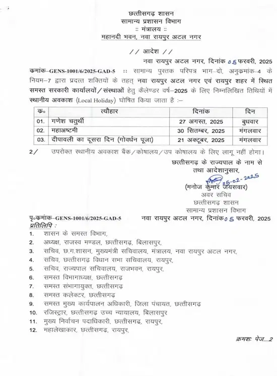 छत्तीसगढ़ में साल 2025 के लिए छुट्टियों का कैलेंडर