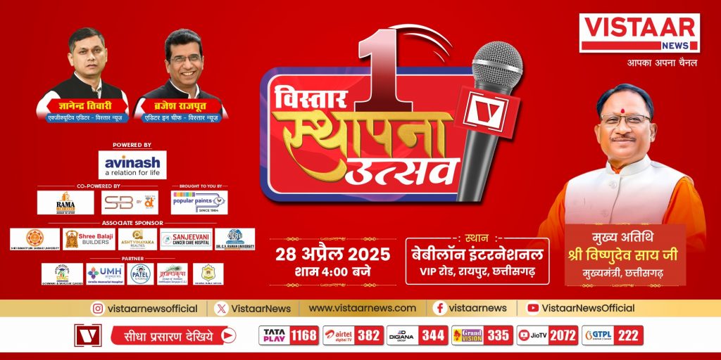 Vistaar Sthapana Utsav: मध्य प्रदेश और छत्तीसगढ़ का सबसे लोकप्रिय टीवी चैनल विस्तार न्यूज़ (Vistaar News) को एक साल पूरे हो गए हैं. अलग-अलग सोशल मीडिया प्लेटफॉर्म एक्स (X), फेसबुक (Facebook), यूट्यूब (Youtube) और इंस्टाग्राम (Instagram) पर अलग मुकाम हासिल किया है. एक साल के इसी जश्न को मनाने के लिए छत्तीसगढ़ की राजधानी रायपुर में 28 अप्रैल को बेबीलोन इंटरनेशनल (Hotel Babylon International) में विस्तार स्थापना उत्सव मनाया जाएगा.