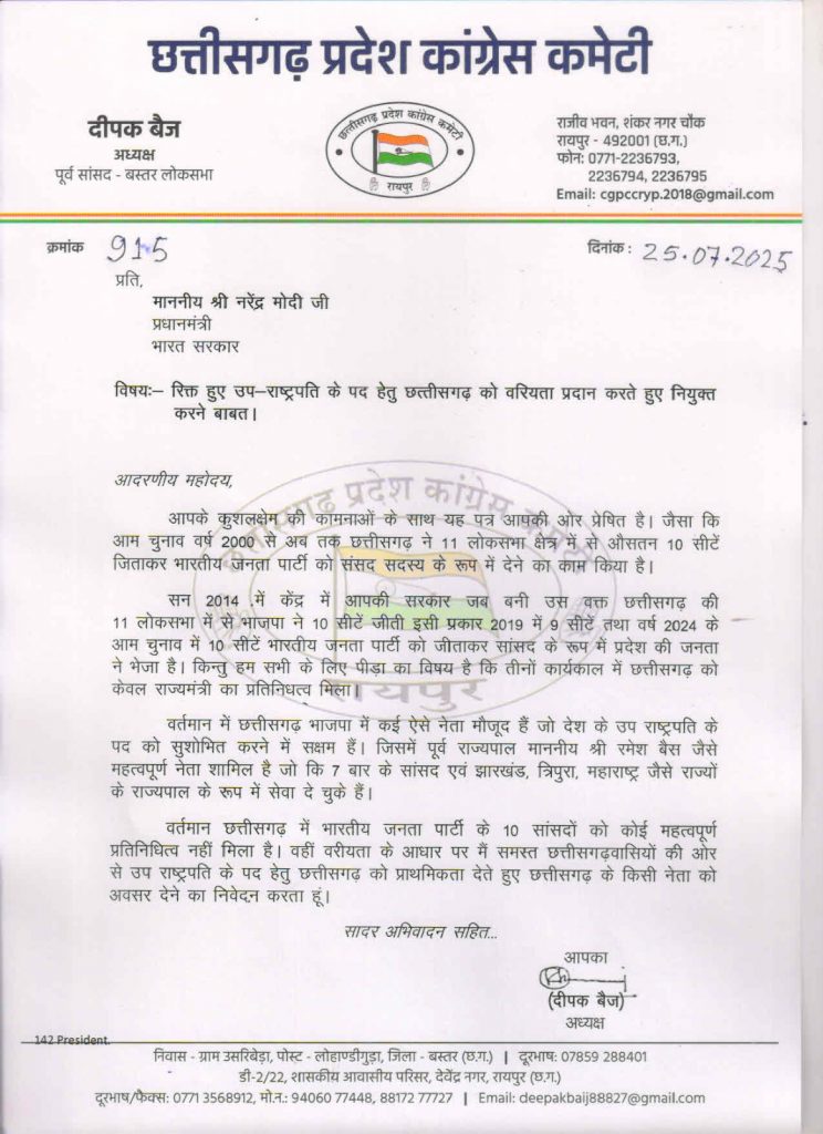 दीपक बैज ने PM मोदी को पत्र लिखा कि वर्तमान में छत्तीसगढ़ भाजपा में कई ऐसे नेता मौजूद हैं जो देश के उप राष्ट्रपति के पद को सुशोभित करने में सक्षम हैं. जिसमें पूर्व राज्यपाल रमेश बैस जैसे महत्वपूर्ण नेता शामिल है जो कि 7 बार के सांसद एवं झारखंड, त्रिपुरा, महाराष्ट्र जैसे राज्यों के राज्यपाल के रूप में सेवा दे चुके हैं.