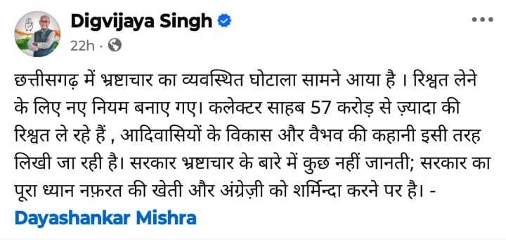 न्यूजपेपर की खबर के कटआउट को शेयर करते हुए दिग्विजय सिंह ने लिखा- ‘छत्तीसगढ़ में भ्रष्टाचार का व्यवस्थित घोटाला सामने आया है. रिश्वत लेने के लिए नए नियम बनाए गए. कलेक्टर साहब 57 करोड़ से ज़्यादा की रिश्वत ले रहे हैं , आदिवासियों के विकास और वैभव की कहानी इसी तरह लिखी जा रही है. सरकार भ्रष्टाचार के बारे में कुछ नहीं जानती; सरकार का पूरा ध्यान नफ़रत की खेती और अंग्रेज़ी को शर्मिन्दा करने पर है.’