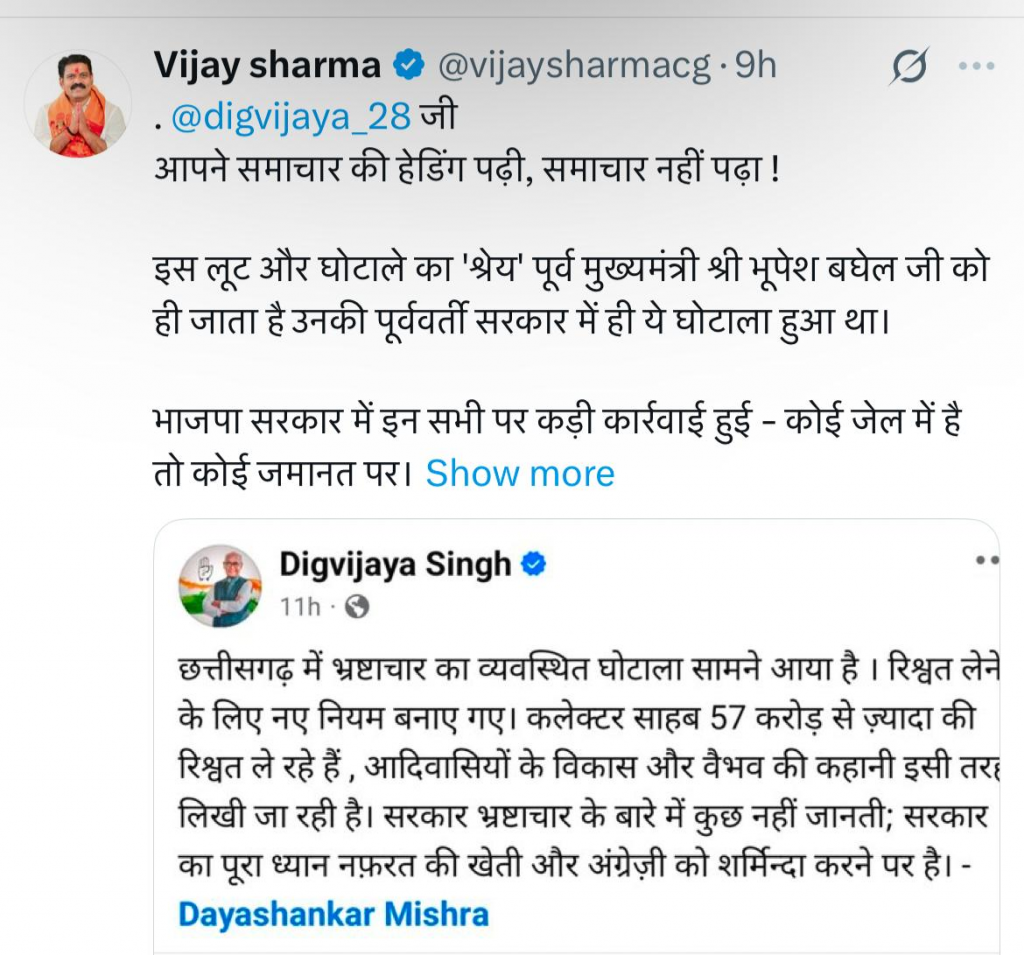 ‘हेडिंग पढ़ी, समाचार नहीं पढ़ा…’, करोड़ों के घोटाले पर बोलकर बुरी तरह फंस गए दिग्विजय सिंह, विजय शर्मा ने ली चुटकी, CG से MP तक सियासी पारा हाई
