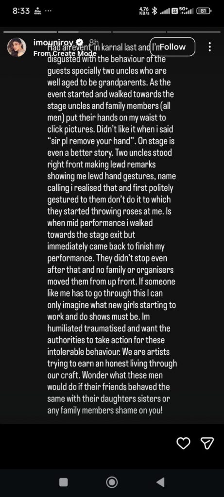 एक्ट्रेस मौनी रॉय ने इंस्टाग्राम पर पोस्ट करते हुए लिखा, ‘मैं करनाल में एक इवेंट में गई थी. यहां मेहमानों के व्यवहार से, खासकर दो अंकल लोगों के व्यवहार से, जो दादा-दादी की उम्र के हैं, मुझे बेहद घृणा हुई. जैसे ही कार्यक्रम शुरू हुआ और मैं मंच की तरफ गई, अंकल और उनके परिवार के सदस्यों (सभी पुरुष) ने मेरी कमर पर हाथ रखकर फोटो खींचनी शुरू कर दीं. मैंने कहा कि सर प्लीज हाथ हटा लीजिए. मुझे ये बिल्कुल पसंद नहीं आया. मंच पर तो और भी बुरा हाल था. दो अंकल ठीक मेरे सामने खड़े होकर अश्लील टिप्पणियां कर रहे थे. मुझे अश्लील इशारे कर रहे थे और गालियां दे रहे थे.मैंने विनम्रता के साथ ऐसा ना करने का इशारा किया, जिसके बाद उन्होंने मेरे ऊपर गुलाब फेंकना शुरू कर दिया. इस दौरान मैं मंच से बाहर जाने लगी, लेकिन तुरंत वापस आकर अपनी परफॉर्मेंस दी. इसके बाद भी वे नहीं रुके. ना ही आयोजकों ने उन्हों सामने से हटाया.’