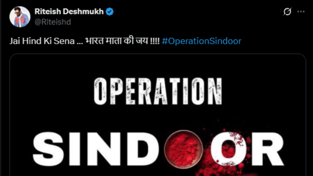 ‘ऑपरेशन सिंदूर’ पर खुशी जताते हुए बॉलीवुड एक्टर रितेश देशमुख ने सोशल मीडिया पर लिखा- ‘Jai Hind Ki Sena … भारत माता की जय !!!!’