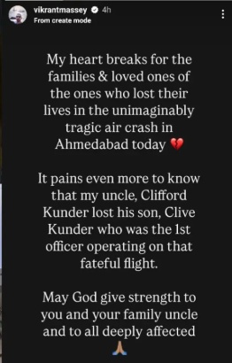 विक्रांत मैसी ने सोशल मीडिया पर अपने दुख को साझा करते हुए लिखा- ‘जिन लोगों ने आज अहमदाबाद में हुए इस बेहद दुखद हादसे में अपनी जान गंवाई, उनके परिवार और अपनों के लिए मेरा दिल टूट गया है. और भी ज्यादा तकलीफ इस बात की है कि मेरे अंकल, क्लिफोर्ड कुंदर ने अपने बेटे, क्लाइव कुंदर को खो दिया, जो उस दुर्भाग्यपूर्ण फ्लाइट में पहले अधिकारी (1st officer) के तौर पर ड्यूटी पर थे. ईश्वर आपको और आपके परिवार को इस मुश्किल घड़ी में हिम्मत दें, और उन सभी को शक्ति दें जो इस हादसे से गहराई से प्रभावित हुए हैं.’ उन्होंने पीड़ित परिवारों के प्रति संवेदना व्यक्त की और इस दुखद घटना को अपने लिए निजी क्षति बताया.