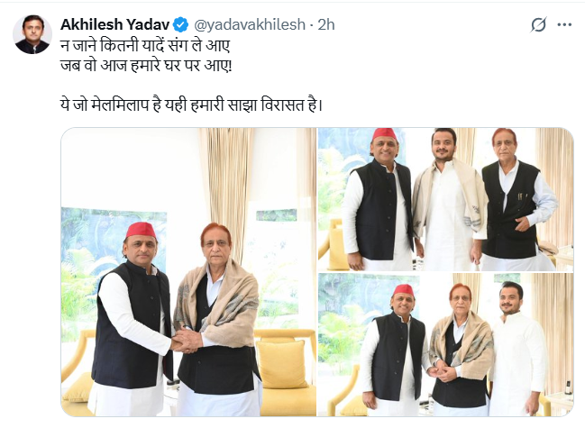 आजम खान से मुलाकात के बाद अखियलश यादव ने एक्स पर पोस्ट करते हुए कहा, “न जाने कितनी यादें संग ले आए. जब वो आज हमारे घर पर आए. ये जो मेलमिलाप है यही हमारी साझा विरासत है.” इस पोस्ट के साथ अखिलेश ने आजम खान और अब्दुल्ला के साथ तस्वीरें शेयर कीं.