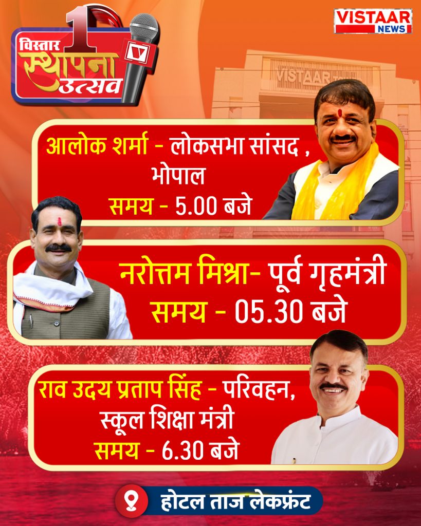 विस्तार स्थापना उत्सव पर विचार का मंच सजेगा. विचार से विकास तक की चर्चा होगी. कार्यक्रम में मंच से समसामयिक मुद्दों से लेकर अलग-अलग मुद्दों पर गहनता से चर्चा होगी. देश से लेकर दुनिया तक हम हैं, सच के सफर में, इस सोच को लेकर शाम 5 बजे से चर्चा का मंच सजेगा. इसमें मध्य प्रदेश की राजनीति की बड़ी हस्तियां शामिल होंगी. बीजेपी और कांग्रेस दोनों पार्टियों के वरिष्ठ और दिग्गज नेता शिरकत करेंगे.