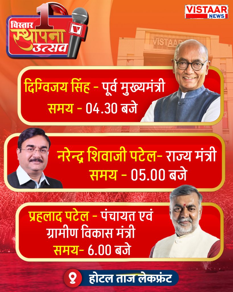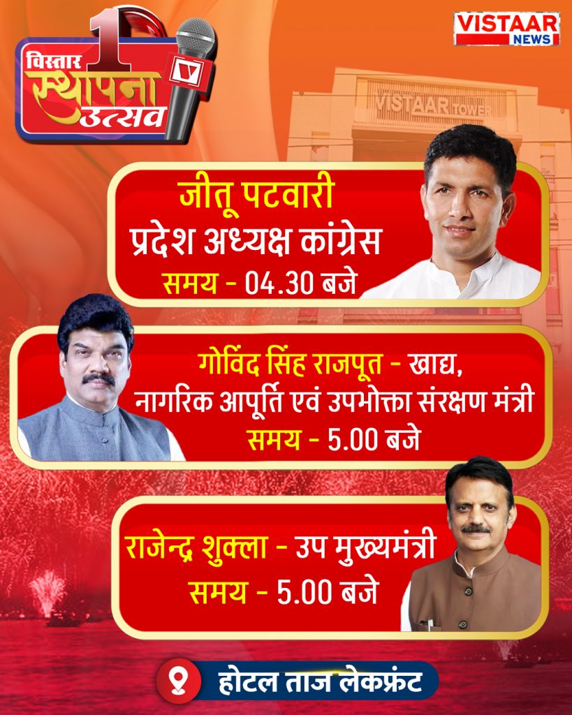 विस्तार न्यूज़ के स्थापना उत्सव पर विचारों का मंच सजेगा. इसमें मध्य प्रदेश के मुख्यमंत्री डॉ. मोहन यादव शिरकत करेंगे. उनके अलावा डिप्टी सीएम राजेंद्र शुक्ल, पंचायत ग्रामीण विकास मंत्री प्रह्लाद पटेल, खेल एवं युवा कल्याण मंत्री विश्वास सारंग, राज्यमंत्री (स्वतंत्र प्रभार) कृष्णा गौर, राज्यमंत्री प्रतिमा बागरी, कांग्रेस प्रदेश अध्यक्ष जीतू पटवारी, पूर्व मुख्यमंत्री और राज्यसभा सांसद दिग्विजय और भोपाल सांसद आलोक शर्मा समेत कई दिग्गज शामिल होंगे.