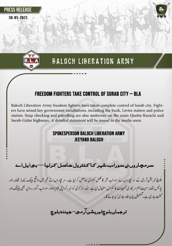 Balochistan Liberation Army: बलूचिस्तान प्रांत के सुराब शहर में बलूच लिबरेशन आर्मी (BLA) ने पूरे शहर पर कब्जा करने का दावा किया है.