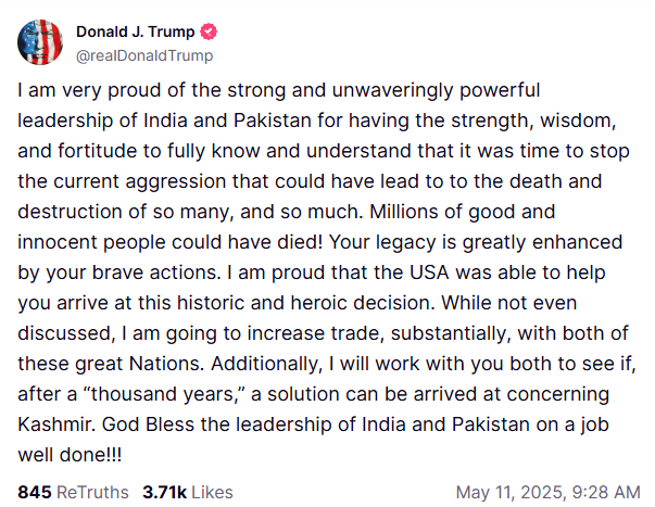 ट्रंप ट्रुथ सोशल पर पोस्ट कर लिखा- ‘यह युद्ध विनाश कारण बन सकता था और लाखों अच्छे और निर्दोष लोग मारे जा सकते थे. मैं भारत और पाकिस्तान के मज़बूत और नेतृत्व पर गर्व करता हूं. दोनों देशों ने समय रहते यह समझ लिया कि इस संघर्ष को रोकना आवश्यक था, जिससे लाखों निर्दोष जानें बचाई जा सकीं. यह निर्णय न केवल बहादुरी भरा है, बल्कि इन दोनों देशों की विरासत को और गौरवशाली बनाता है.’
