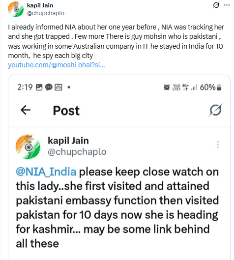 मई 2024 में एक यूजर, कपिल जैन, ने सोशल मीडिया प्लेटफॉर्म X पर राष्ट्रीय जांच एजेंसी (NIA) को टैग करते हुए ज्योति की संदिग्ध गतिविधियों के बारे में आगाह किया था. पोस्ट में उनकी पाकिस्तान और कश्मीर यात्राओं को संभावित खतरे के रूप में उजागर किया गया था. हालांकि, इस चेतावनी पर समय रहते कार्रवाई न होने से सुरक्षा एजेंसियों की कार्यप्रणाली पर सवाल उठ रहे हैं.