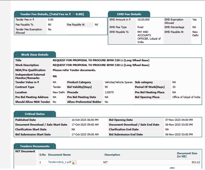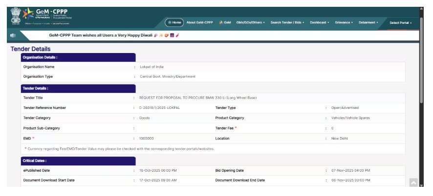 लोकपाल ने 16 अक्टूबर को सेंट्रल पब्लिक प्रोक्योरमेंट पोर्टल पर एक टेंडर जारी किया, जिसमें सात BMW 3 सीरीज Li कारों की आपूर्ति के लिए बोली मांगी गई है. टेंडर के मुताबिक, बोली जमा करने की प्रक्रिया 17 अक्टूबर से शुरू हो चुकी है और 6 नवंबर को दोपहर 3 बजे तक चलेगी. 7 नवंबर से बोली की जांच शुरू होगी. इन कारों की डिलीवरी सप्लाई ऑर्डर मिलने के 30 दिनों के भीतर और अगर संभव हो तो दो हफ्तों में करनी होगी. टेंडर में साफ कहा गया है कि डिलीवरी में देरी बर्दाश्त नहीं की जाएगी.